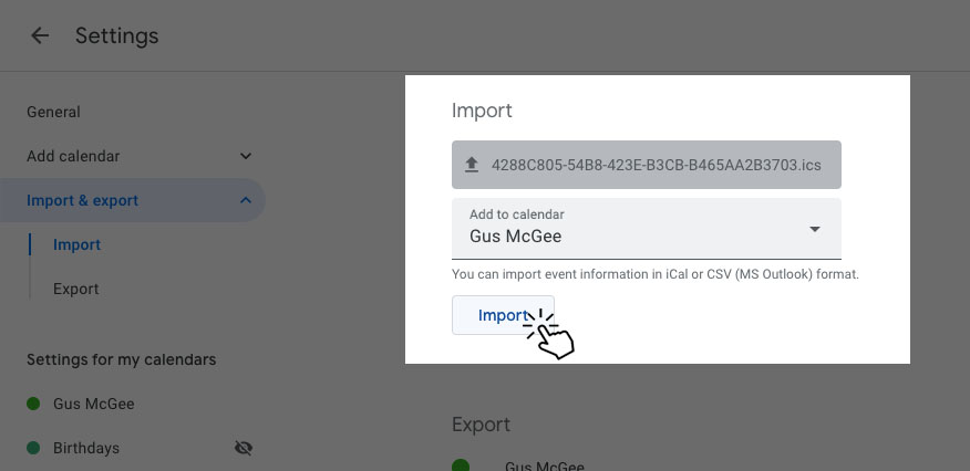 • Finally, click the “Select file from your computer” button. A file browser will open. Choose the file that downloaded earlier. It will likely have a very long file name ending in .ics, such as, 4298C805-54B9-423E-B4CB-B465AA2B3703.ics. Double click the file, then click “Import” in the Settings page:
