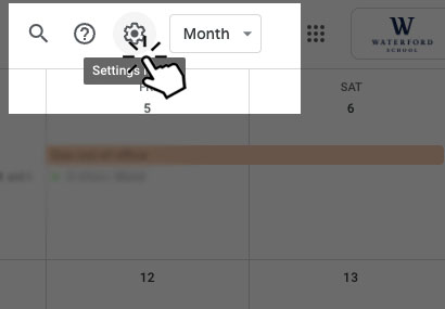 • From your main calendar.google.com page, click the gear icon in the top right followed by “Settings” to access the Calendar Settings menu