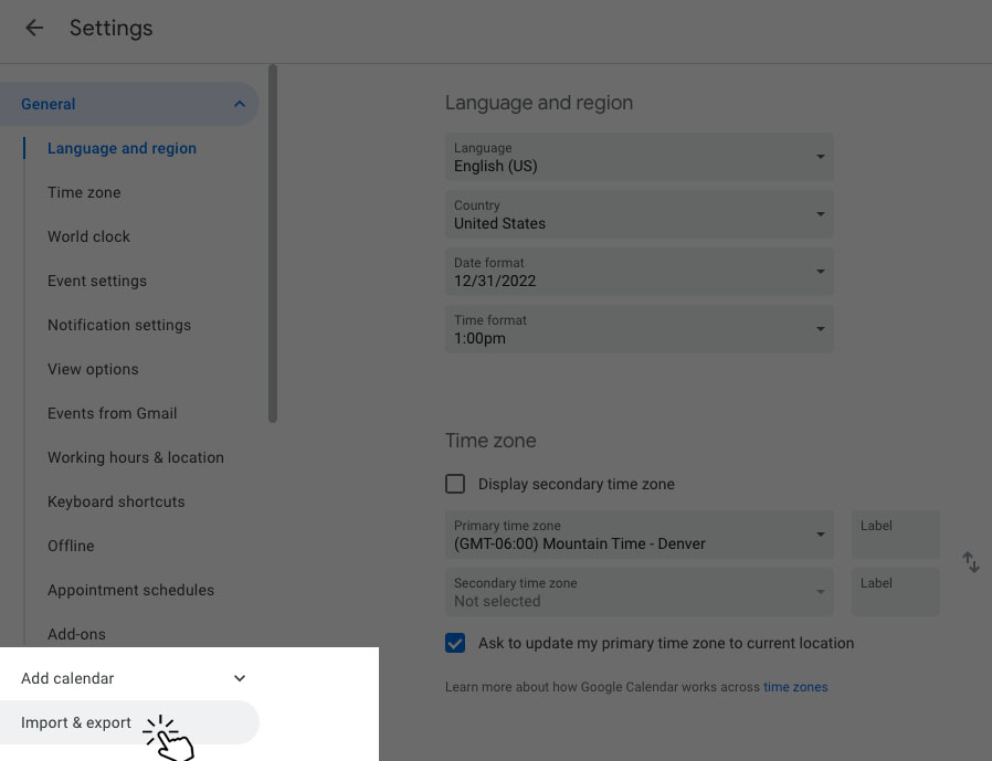 • Finally, click the “Select file from your computer” button. A file browser will open. Choose the file that downloaded from step 5. It will likely have a very long file name ending in .ics, such as, 4298C805-54B9-423E-B4CB-B465AA2B3703.ics. Double click the file, then click “Import” in the Settings page: