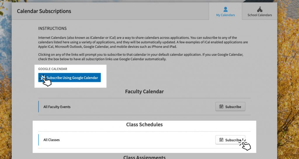 3. If you have not yet added the “All Classes” calendar to your Google Calendar, follow the first set of steps. If you’ve already subscribed to the “All Classes” calendar from Veracross, follow the second set of steps.