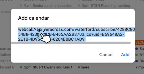 • Your browser will switch to Google Calendar and launch an “Add calendar” popup. Click the “webcal://api.veracross…” three times quickly to select the whole URL, then press command+C on your keyboard or right click it and select Copy to copy the URL:
