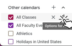 • Open your Google Calendar. Locate the calendar titled “All Classes” in the “Other Calendars” section in the lefthand pane of your Google Calendar and click the three dot menu next to the title. Note: It is very important to make sure you are clicking the three dots next to “All Classes” as shown below: