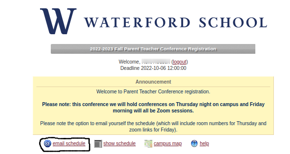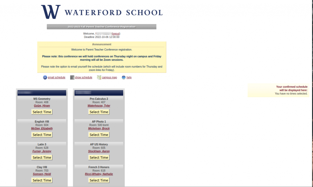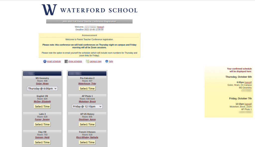 You will be directed to a page that will list your students and their classes. From this page, you can select a time to conference with each teacher. You can also view and email yourself the schedule.