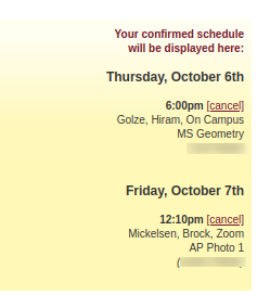 Please double check your final schedule in yellow on the right side of the screen. Make sure it contains your desired schedule. NOTE: you can cancel the conference time by clicking the red cancel link by each time.