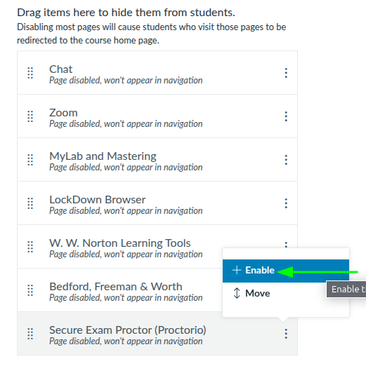 2. Login to Canvas and navigate to the course where you would like to use Proctorio. In the course settings go to the “Navigation” tab and make sure to enable Proctorio.