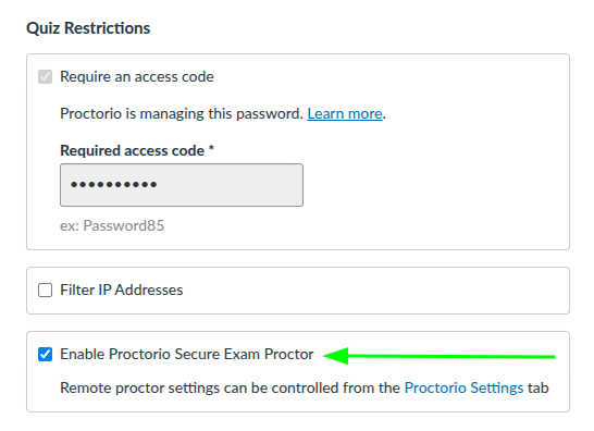 2. To use Proctorio with a particular quiz be sure to select “Enable Proctorio Secure Exam Proctor” under the “Quiz Restrictions” section.