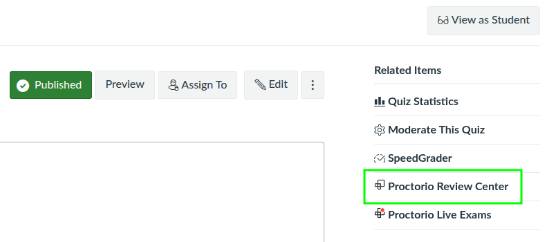 1. To review Proctorio quiz or exam results click into the quiz and select “Proctorio Review Center”.