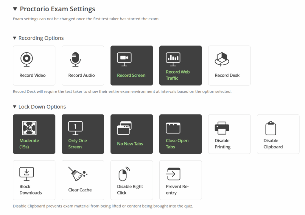 1. You will notice that a new tab appears at the top of the Quiz settings called “Proctorio Settings”. Be sure to click on that tab and select the options you wish to enable (you can save those settings as a profile to use later).
